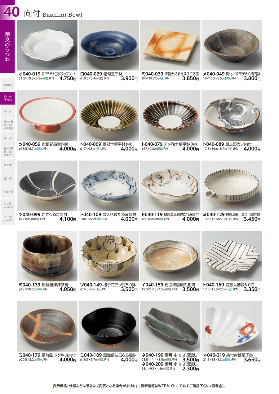 | 原料価格の急激な値上がりにより、画像記載の価格から更新されている場合がございます。 また価格の更新が完了していない商品もございますので、現行の価格は見積もりをもってご報告申し上げます。 | ||||