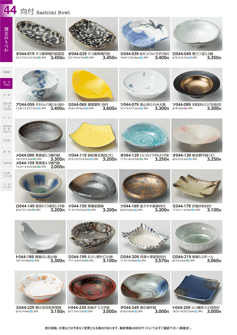 | 原料価格の急激な値上がりにより、画像記載の価格から更新されている場合がございます。 また価格の更新が完了していない商品もございますので、現行の価格は見積もりをもってご報告申し上げます。 | ||||