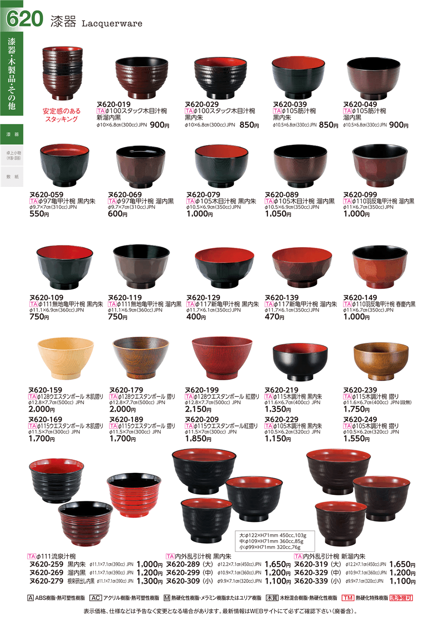 | ヌ620-019 | [TA]φ100スタック木目汁椀 新溜内黒 | 上代 900円(税抜) 卸値 496円(税抜) (45%OFF) | ||