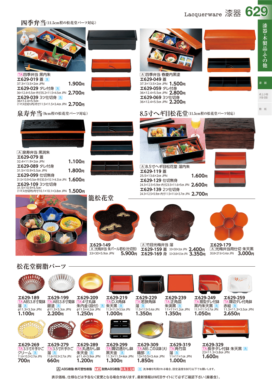 | エ629-059 | [A]四季弁当 春慶内黒塗タレ付身 | 上代 2,800円(税抜) 卸値 1,541円(税抜) (45%OFF) | ||