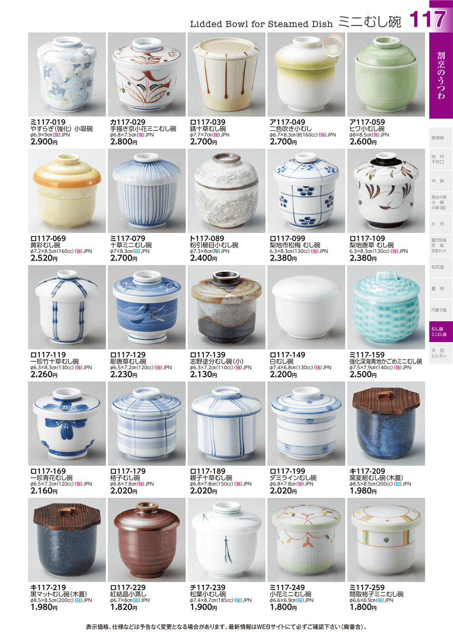 | ロ117-119 | 一珍竹十草むし碗 | 上代 2,260円(税抜) 卸値 1,243円(税抜) (45%OFF) | ||