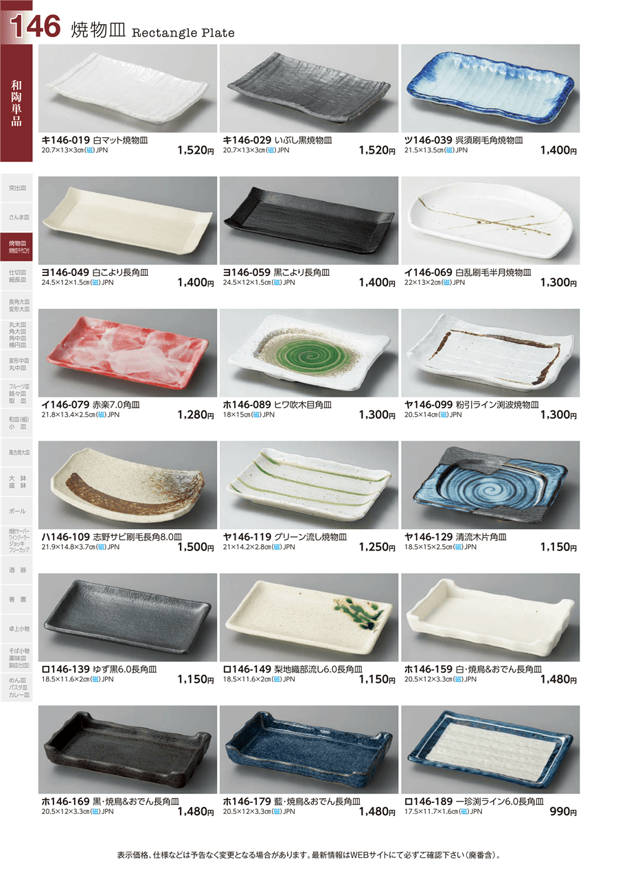 | ロ146-189 | 一珍渕ライン6.0長角皿 | 上代 990円(税抜) 卸値 545円(税抜) (45%OFF) | ||