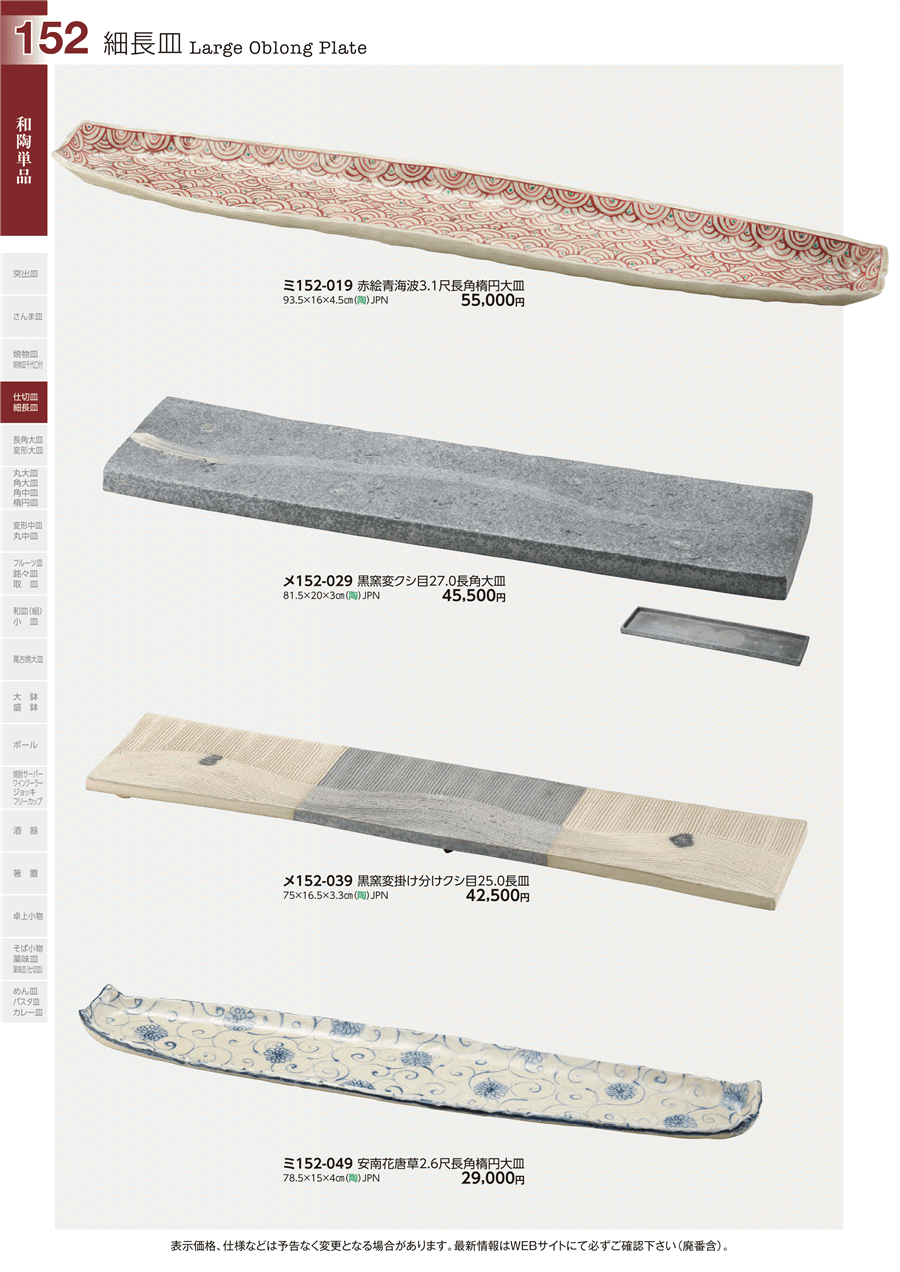 | ミ152-019 | 赤絵青海波3.1尺長角楕円大皿 | 上代 55,000円(税抜) 卸値 30,251円(税抜) (45%OFF) | ||