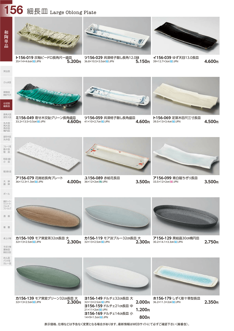 | ヨ156-159 | ドルチェ21㎝長皿 中 | 上代 1,200円(税抜) 卸値 660円(税抜) (45%OFF) | ||