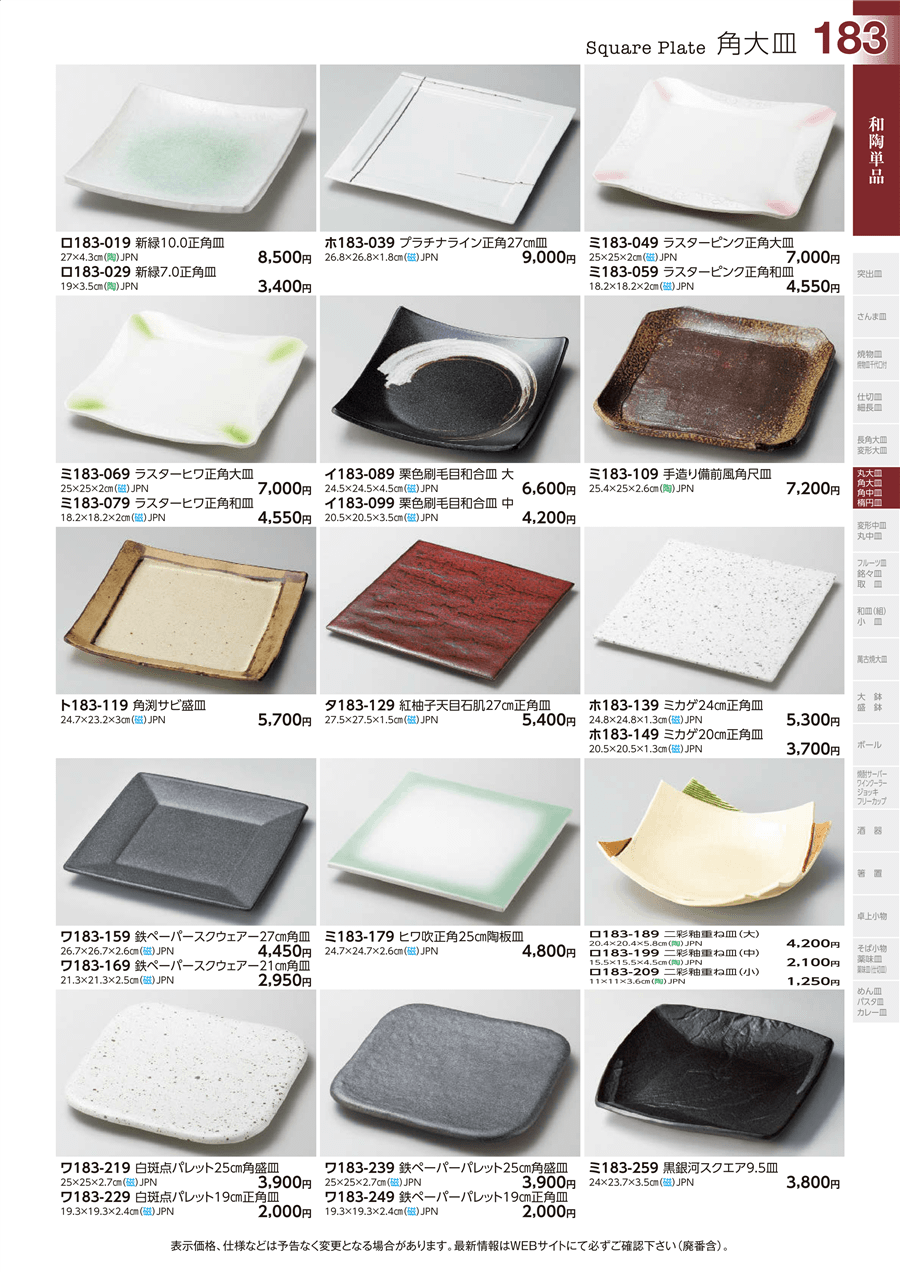| ロ183-029 | 新緑7.0正角皿 | 上代 3,400円(税抜) 卸値 1,871円(税抜) (45%OFF) | ||
