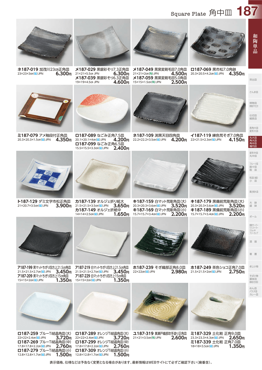 | ロ187-099 | なごみ正角6.5皿 | 上代 2,400円(税抜) 卸値 1,320円(税抜) (45%OFF) | ||