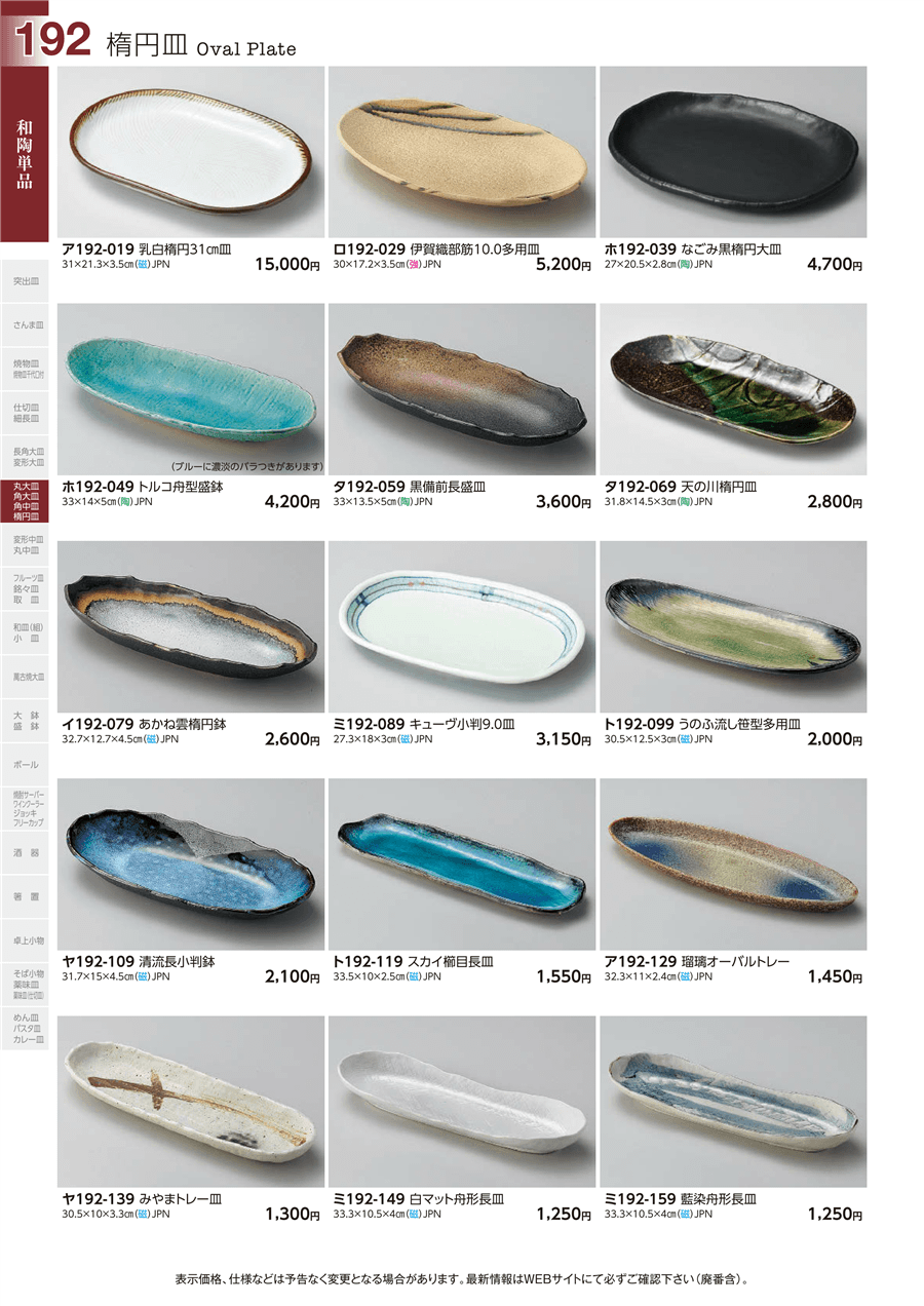 | ア192-019 | 乳白楕円31㎝皿 | 上代 15,000円(税抜) 卸値 8,250円(税抜) (45%OFF) | ||