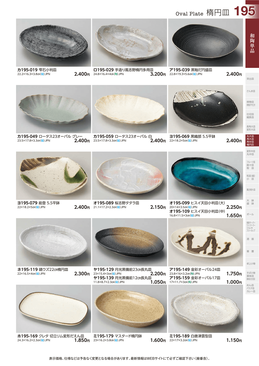 | ロ195-029 | 手造り風志野楕円多用皿 | 上代 3,200円(税抜) 卸値 1,761円(税抜) (45%OFF) | ||