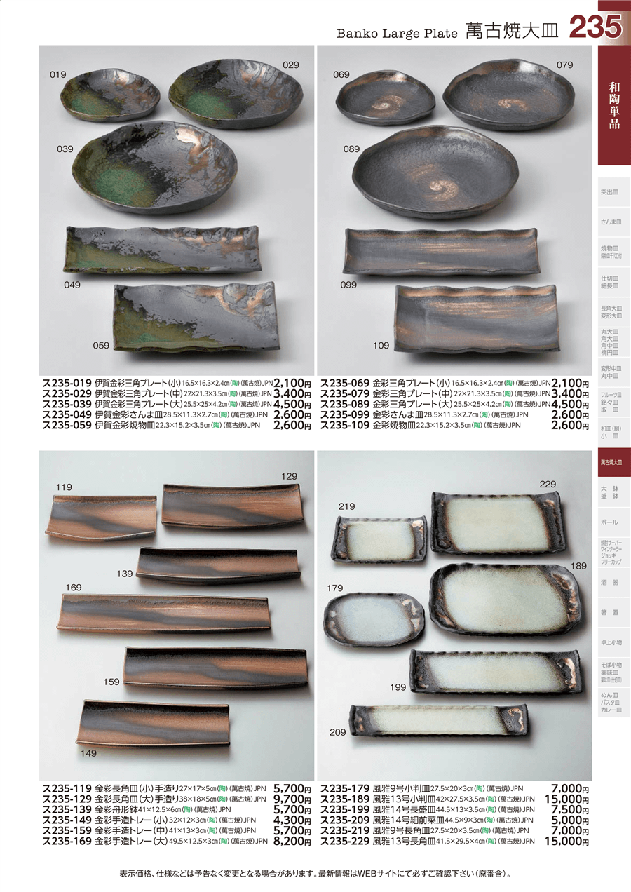 | ス235-129 | 金彩長角皿(大)手造り | 上代 9,700円(税抜) 卸値 5,335円(税抜) (45%OFF) | ||