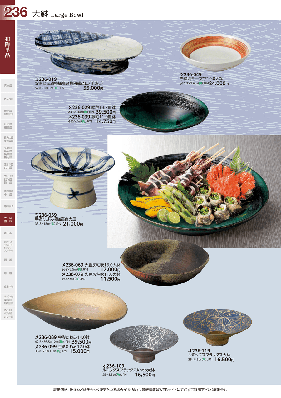 | メ236-029 | 緑釉13.7皿鉢 | 上代 39,500円(税抜) 卸値 21,725円(税抜) (45%OFF) | ||
