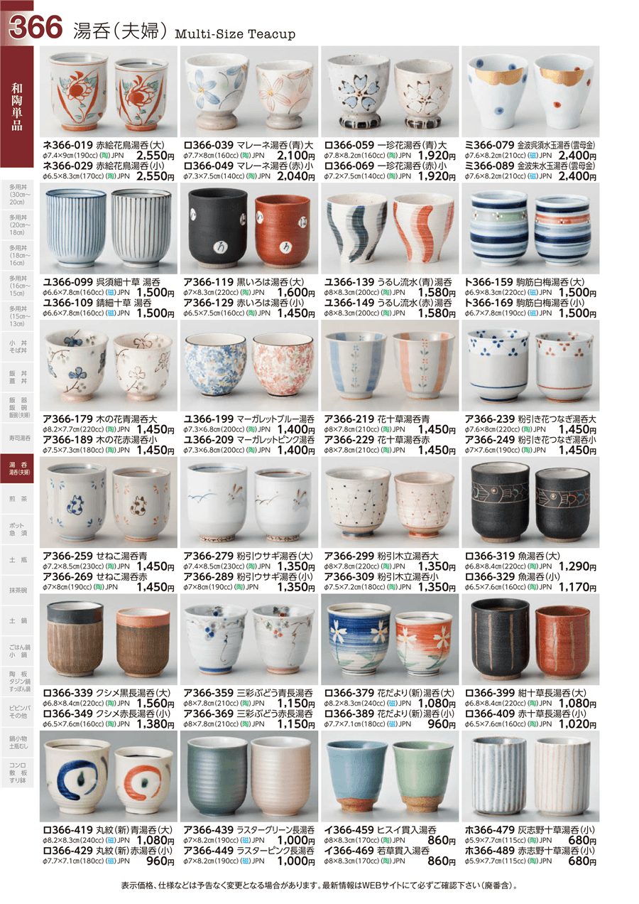 | ネ366-019 | 赤絵花鳥湯呑(大) | 上代 2,550円(税抜) 卸値 1,403円(税抜) (45%OFF) | ||
