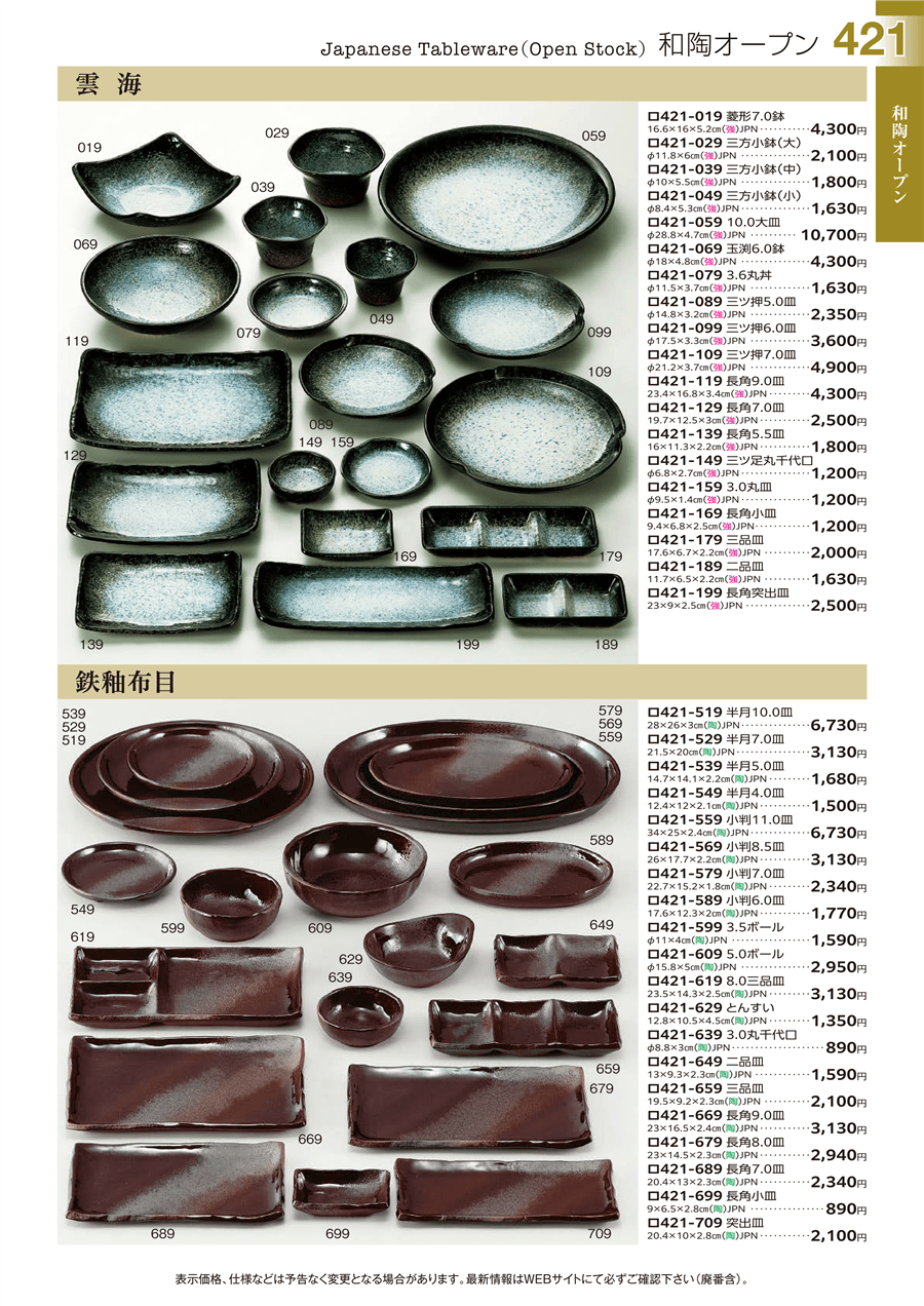 | ロ421-109 | 雲海 三ツ押7.0皿 | 上代 4,900円(税抜) 卸値 2,695円(税抜) (45%OFF) | ||