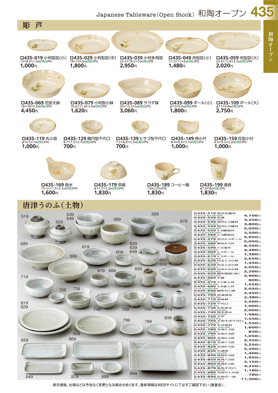| ミ435-619 | 唐津うのふ(土物) 5.3ボール | 上代 2,650円(税抜) 卸値 1,458円(税抜) (45%OFF) | ||