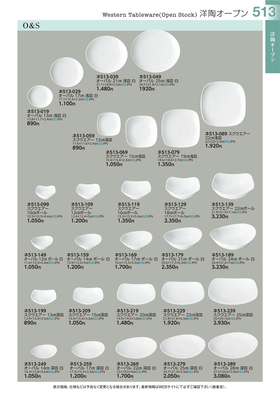 | ネ513-089 | O&S スクウエアー 22㎝浅皿 | 上代 1,920円(税抜) 卸値 1,056円(税抜) (45%OFF) | ||