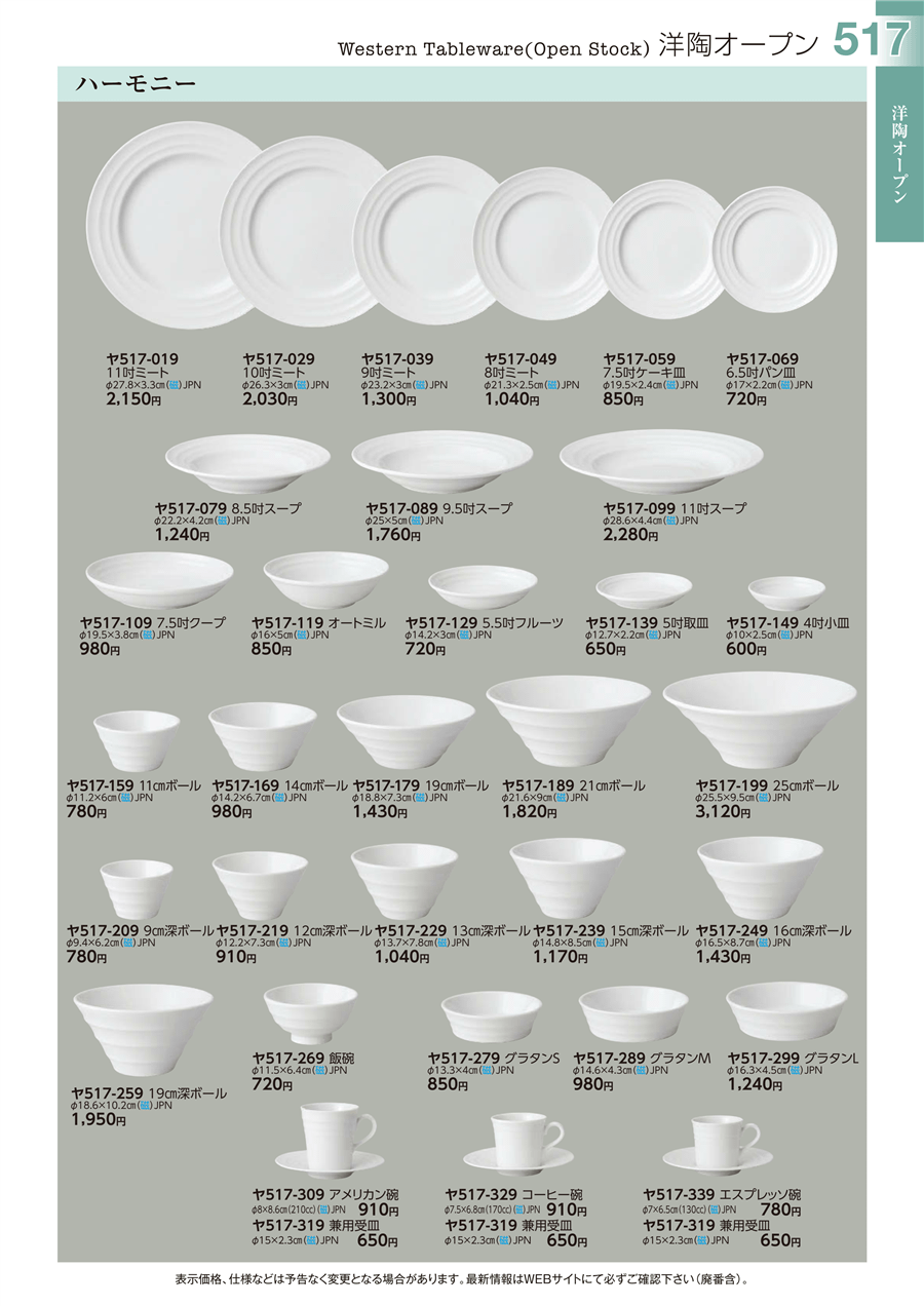 | ヤ517-319 | ハーモニー 兼用受皿 | 上代 650円(税抜) 卸値 358円(税抜) (45%OFF) | ||