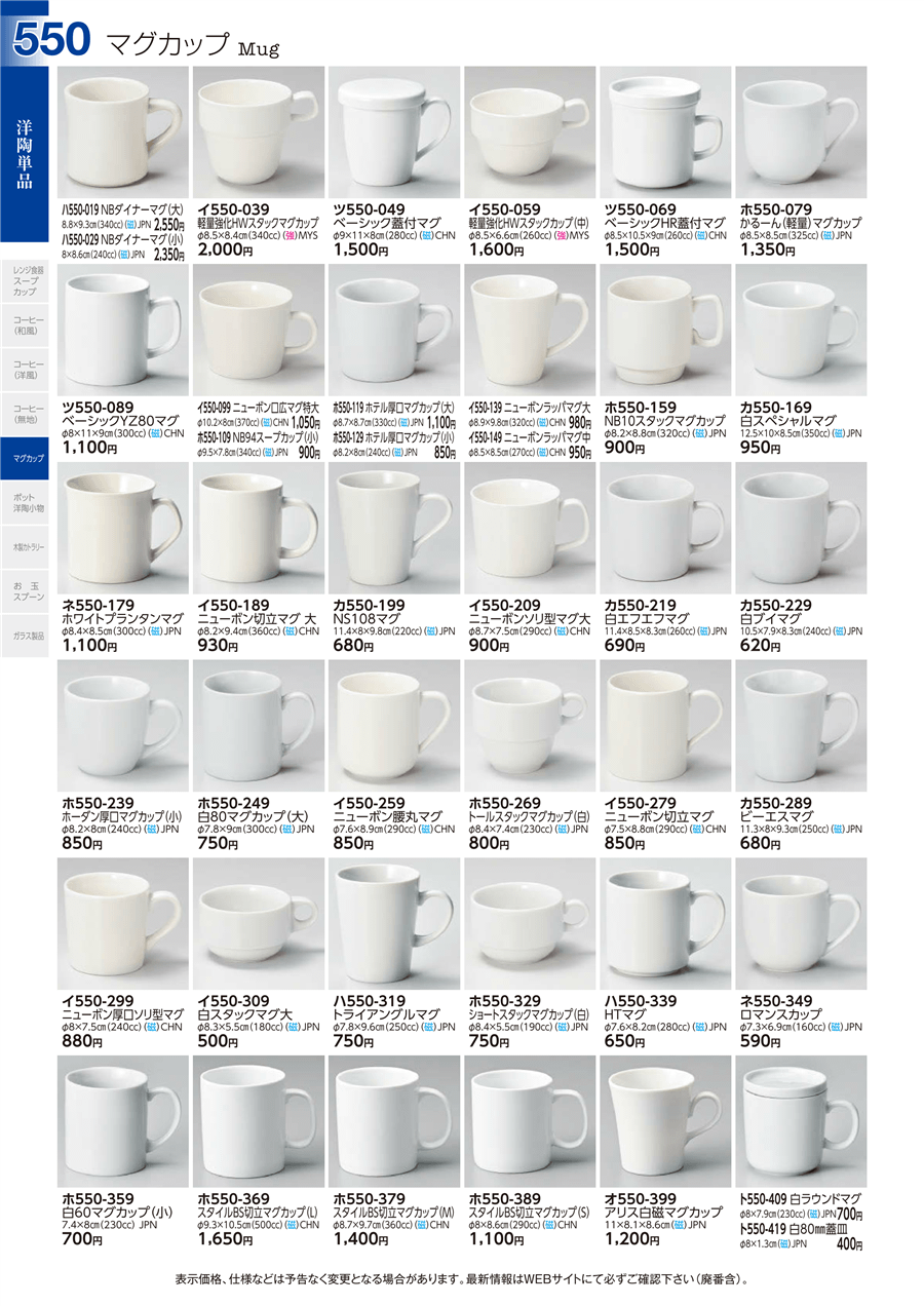| ホ550-269 | トールスタックマグカップ(白) | 上代 800円(税抜) 卸値 441円(税抜) (45%OFF) | ||