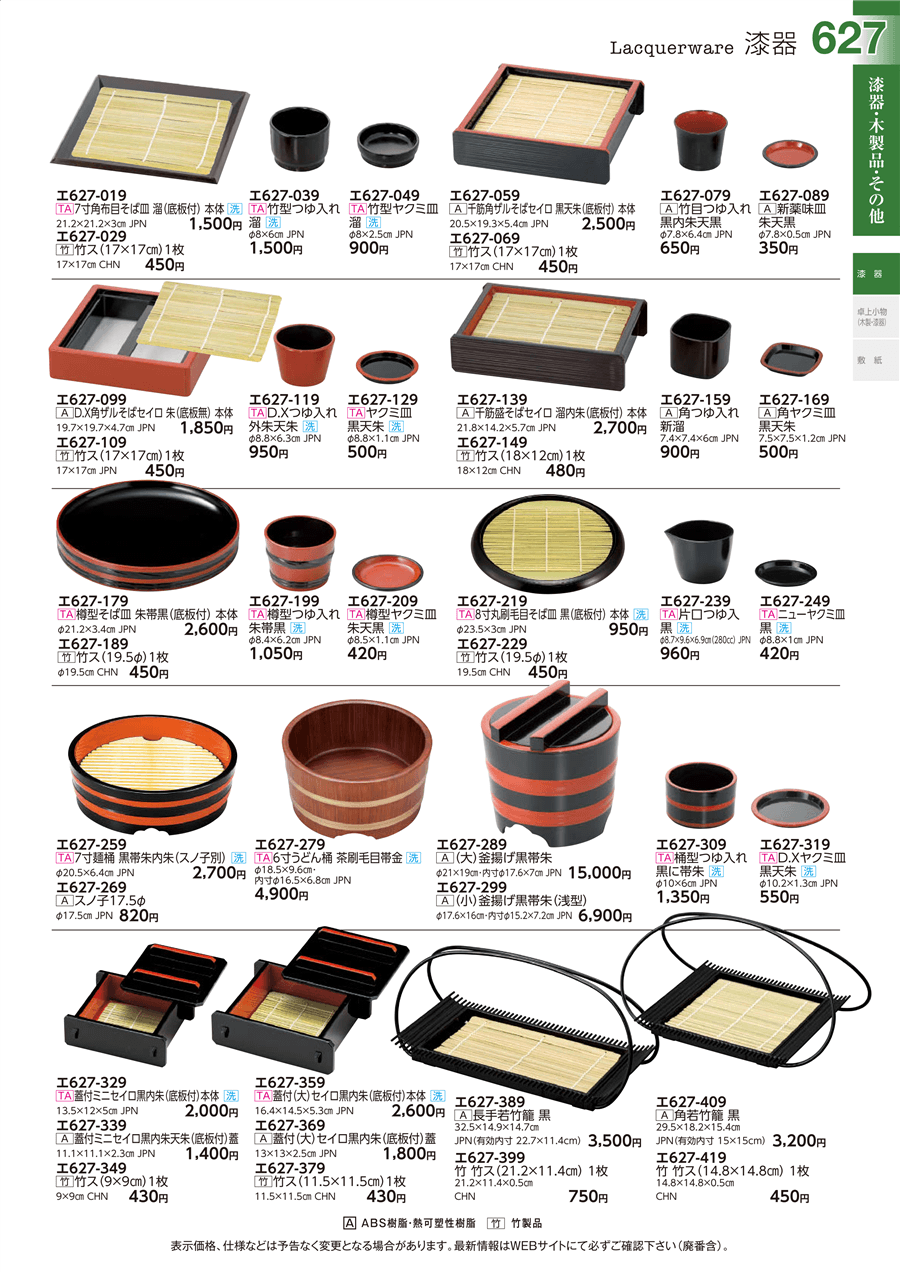 | エ627-139 | [A]千筋盛そばセイロ 溜内朱(底板付) 本体 | 上代 2,700円(税抜) 卸値 1,486円(税抜) (45%OFF) | ||