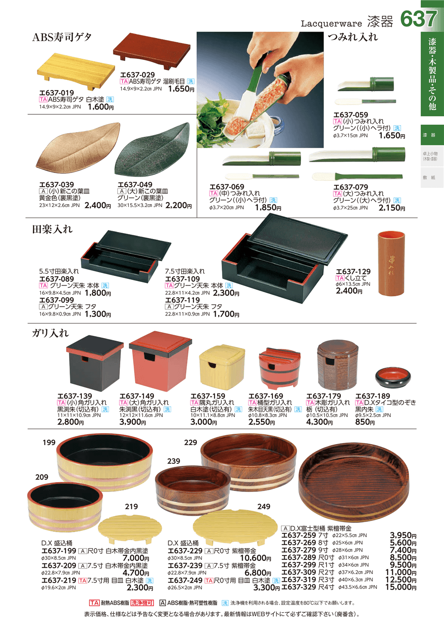 | エ637-209 | [A]D.X盛込桶7.5寸 白木帯金内黒塗 | 上代 4,700円(税抜) 卸値 2,585円(税抜) (45%OFF) | ||
