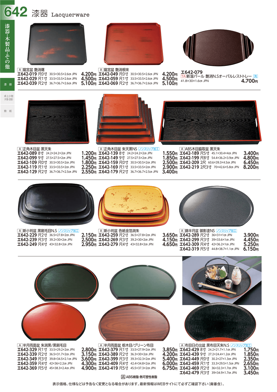 | エ642-199 | [A]ABS木目脇取盆 黒天朱 尺8寸 | 上代 4,800円(税抜) 卸値 2,640円(税抜) (45%OFF) | ||
