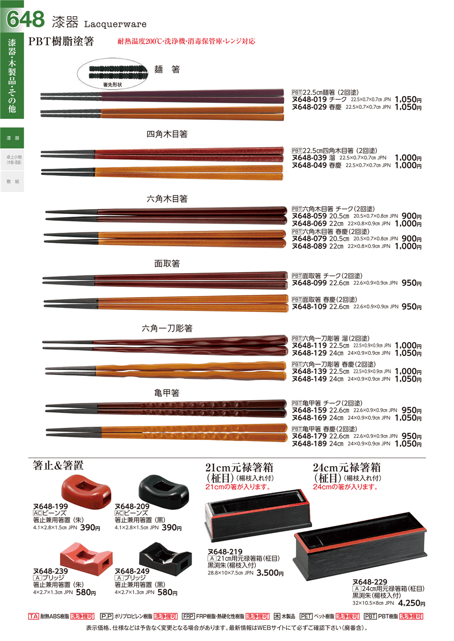 | ヌ648-179 | [PBT]亀甲箸 春慶(2回塗)22.6㎝ | 上代 950円(税抜) 卸値 523円(税抜) (45%OFF) | ||