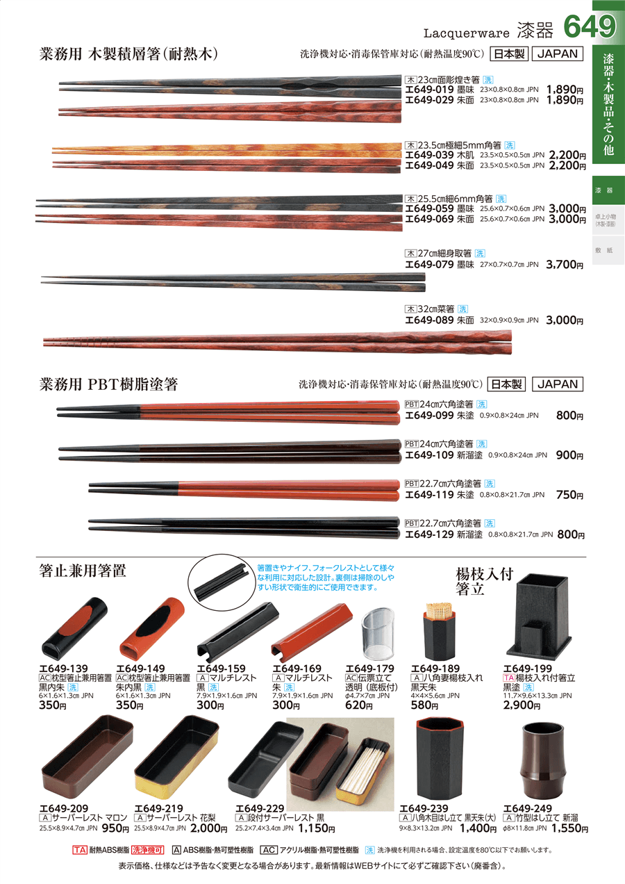 | エ649-109 | [PBT]24㎝六角塗箸新溜塗[洗] | 上代 900円(税抜) 卸値 496円(税抜) (45%OFF) | ||