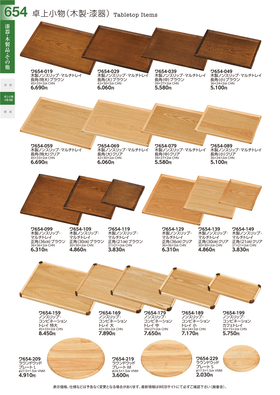 | ワ654-089 | 木製ノンスリップ・マルチトレイ長角(小)クリア | 上代 5,100円(税抜) 卸値 2,805円(税抜) (45%OFF) | ||