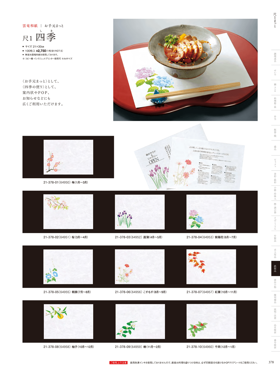 | 21-378-02 | 尺1お手元まっと 四季 桜 (100枚入) | 上代 2,750円(税抜) 卸値 1,815円(税抜) (34%OFF) | ||