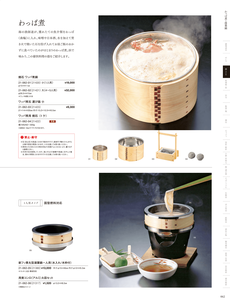 | 21-062-01 | 焼石 ワッパ煮鍋(小)1人用 | 上代 19,000円(税抜) 卸値 12,540円(税抜) (34%OFF) | ||