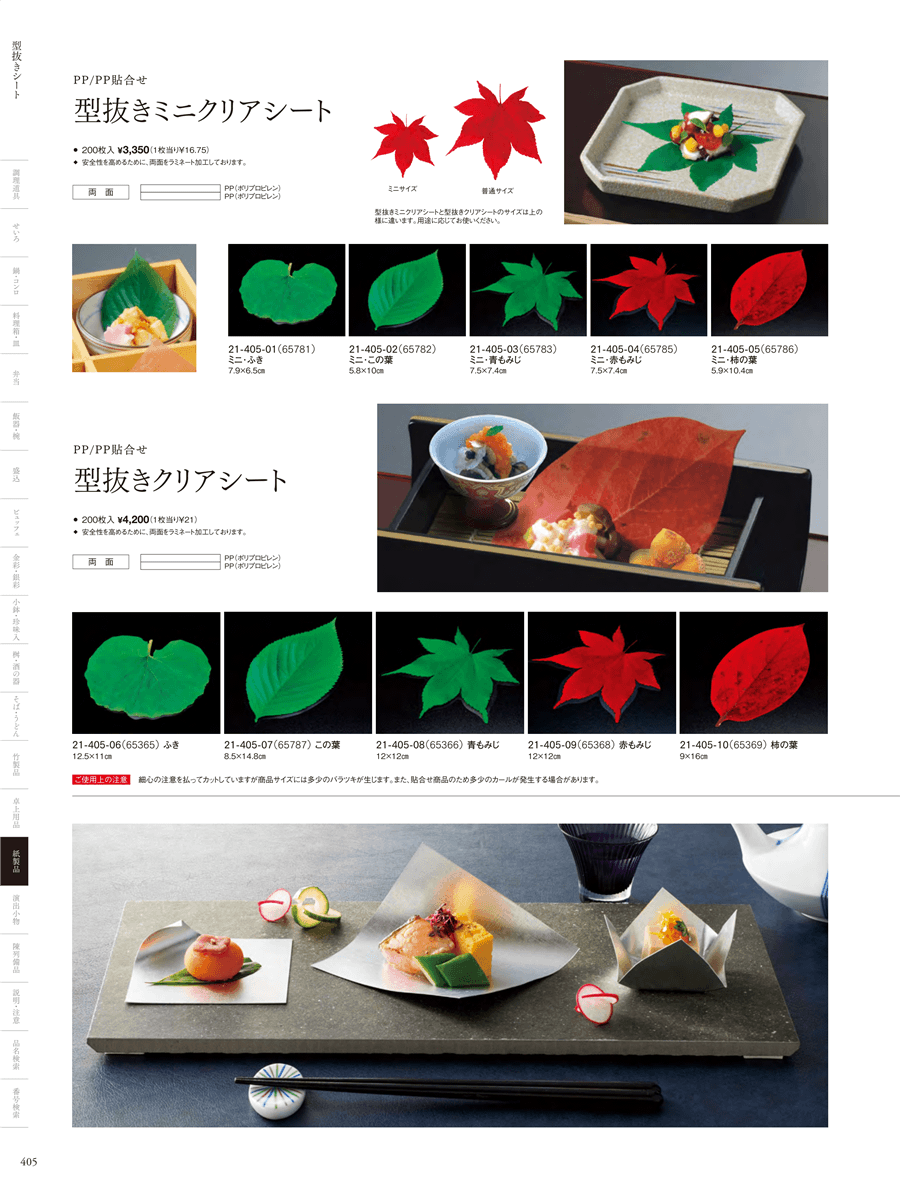 | 21-405-05 | PP貼合せ 型抜きミニ クリアシート 柿の葉 (200枚入) | 上代 3,350円(税抜) 卸値 2,211円(税抜) (34%OFF) | ||