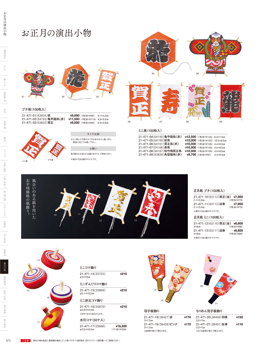 | 21-471-03 | プチ凧 賀正 (100枚入) | 上代 9,000円(税抜) 卸値 5,940円(税抜) (34%OFF) | ||