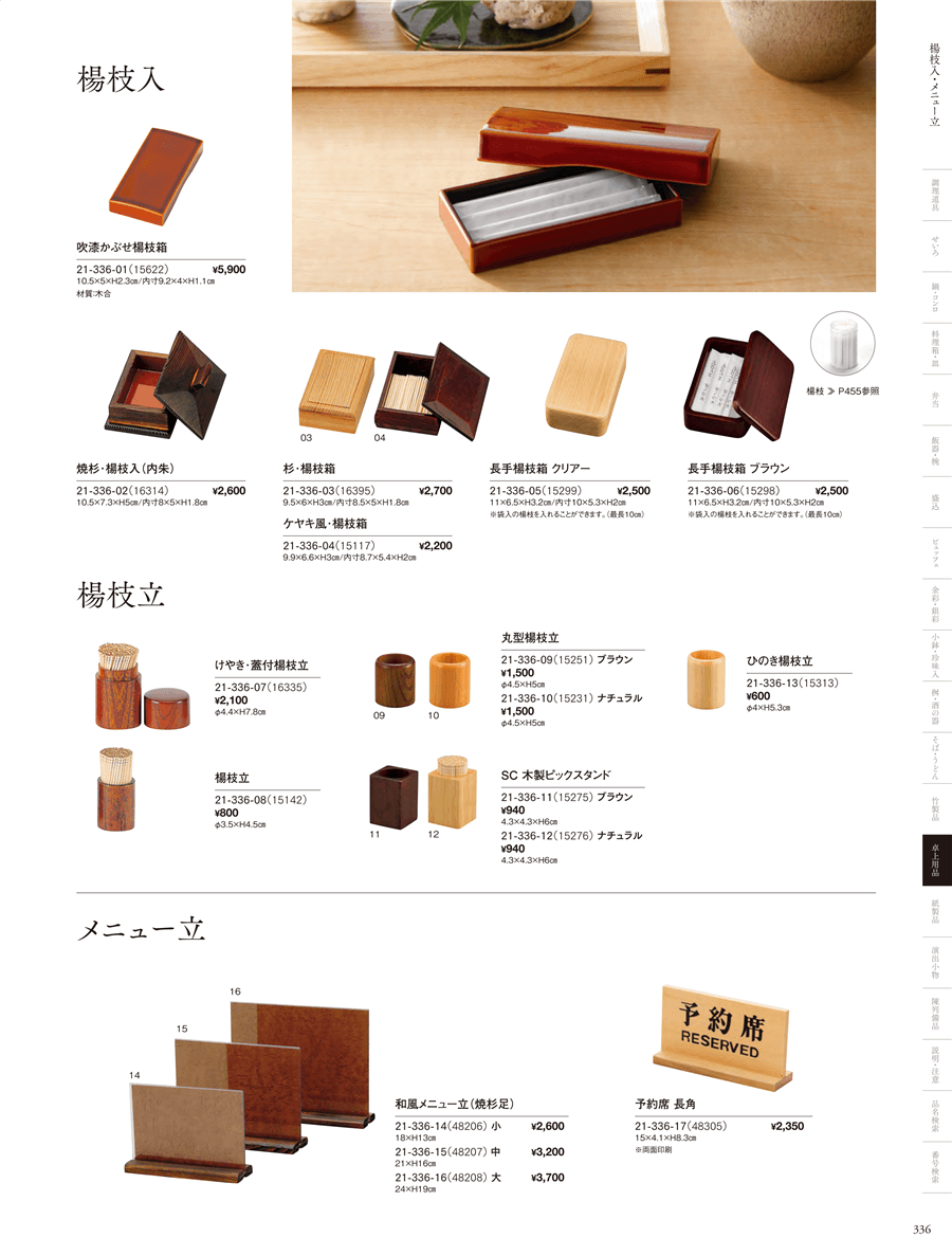 | 21-336-11 | SC 木製ピックスタンド ブラウン | 上代 940円(税抜) 卸値 621円(税抜) (34%OFF) | ||