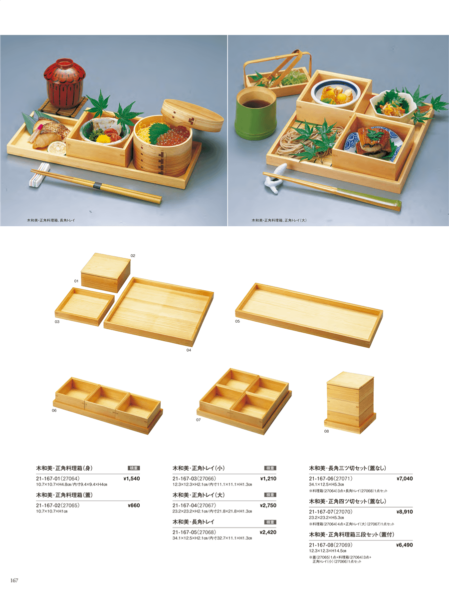 | 21-167-01 | 木和美・正角料理箱(身) | 上代 1,540円(税抜) 卸値 1,017円(税抜) (34%OFF) | ||