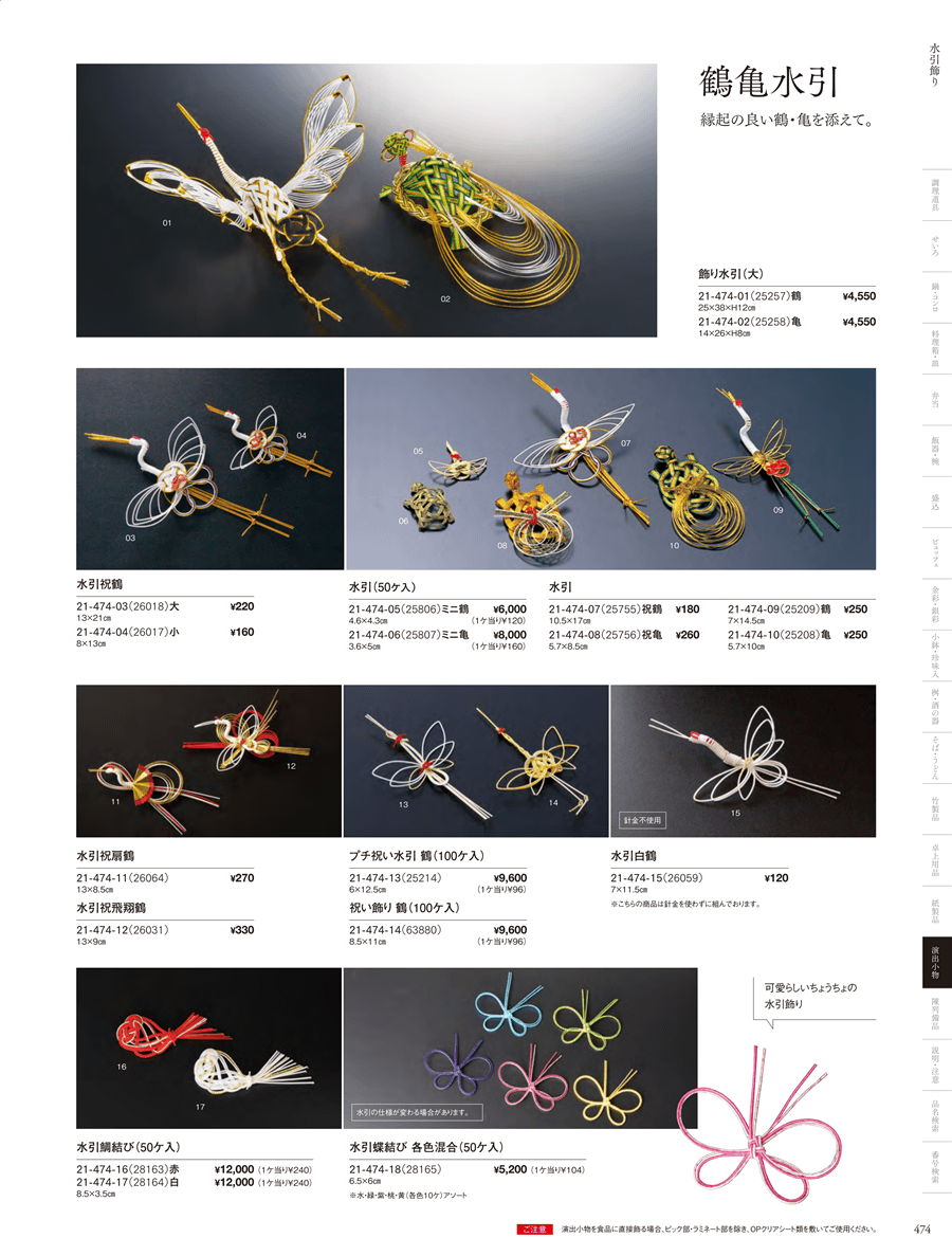 | 21-474-01 | 飾り水引 (大) 鶴 | 上代 4,550円(税抜) 卸値 3,003円(税抜) (34%OFF) | ||