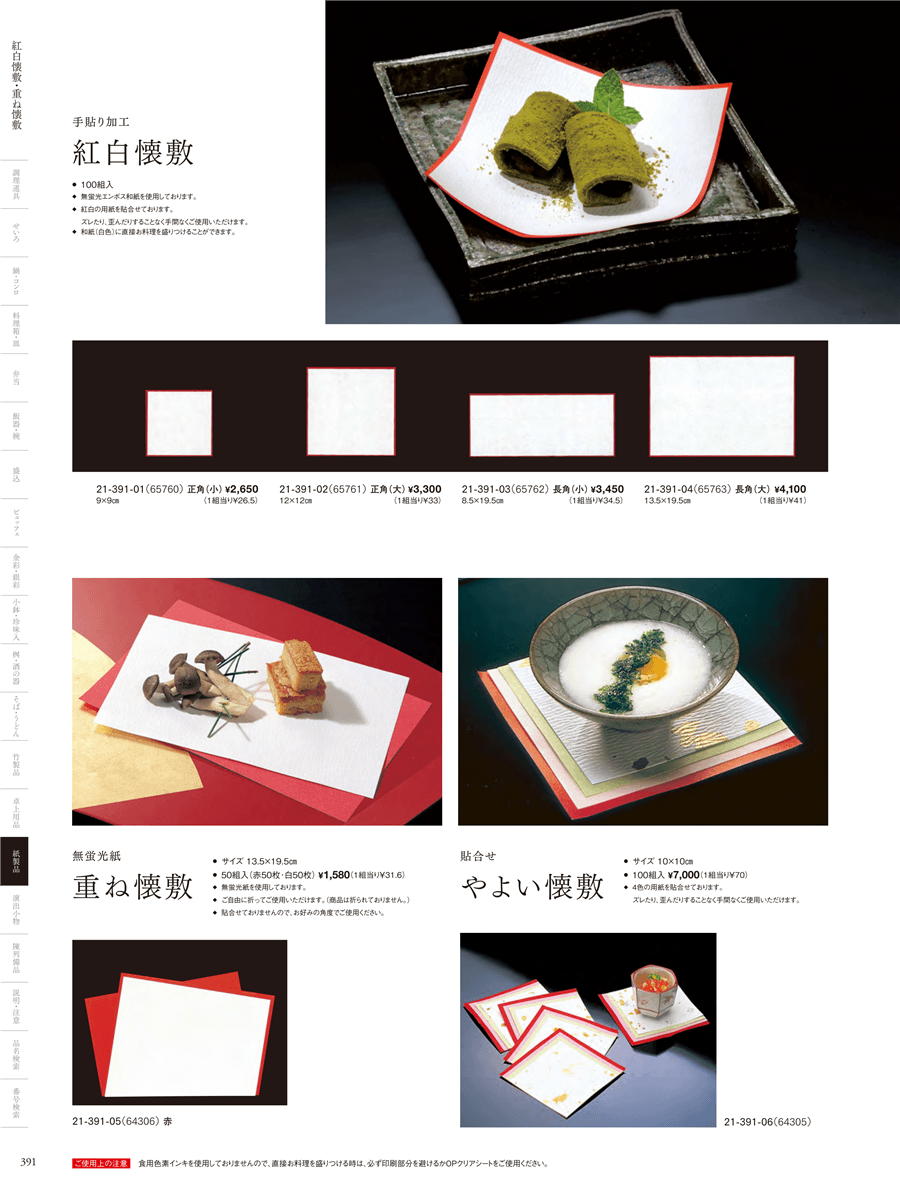 | 21-391-02 | 貼り合わせ 紅白懐敷 正角(大) (100組入) | 上代 3,300円(税抜) 卸値 2,178円(税抜) (34%OFF) | ||