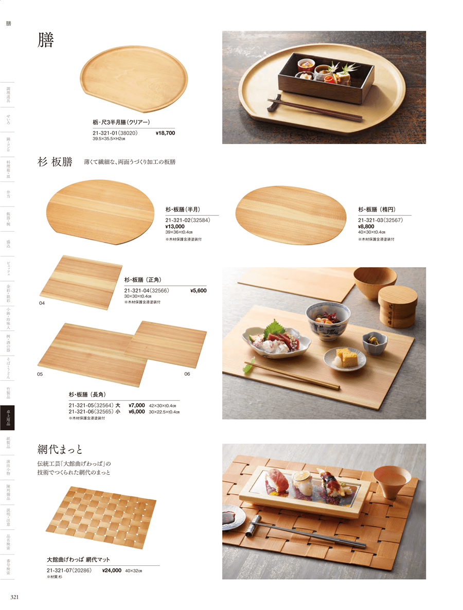 | 21-321-03 | 杉・板膳(楕円) | 上代 8,800円(税抜) 卸値 5,808円(税抜) (34%OFF) | ||