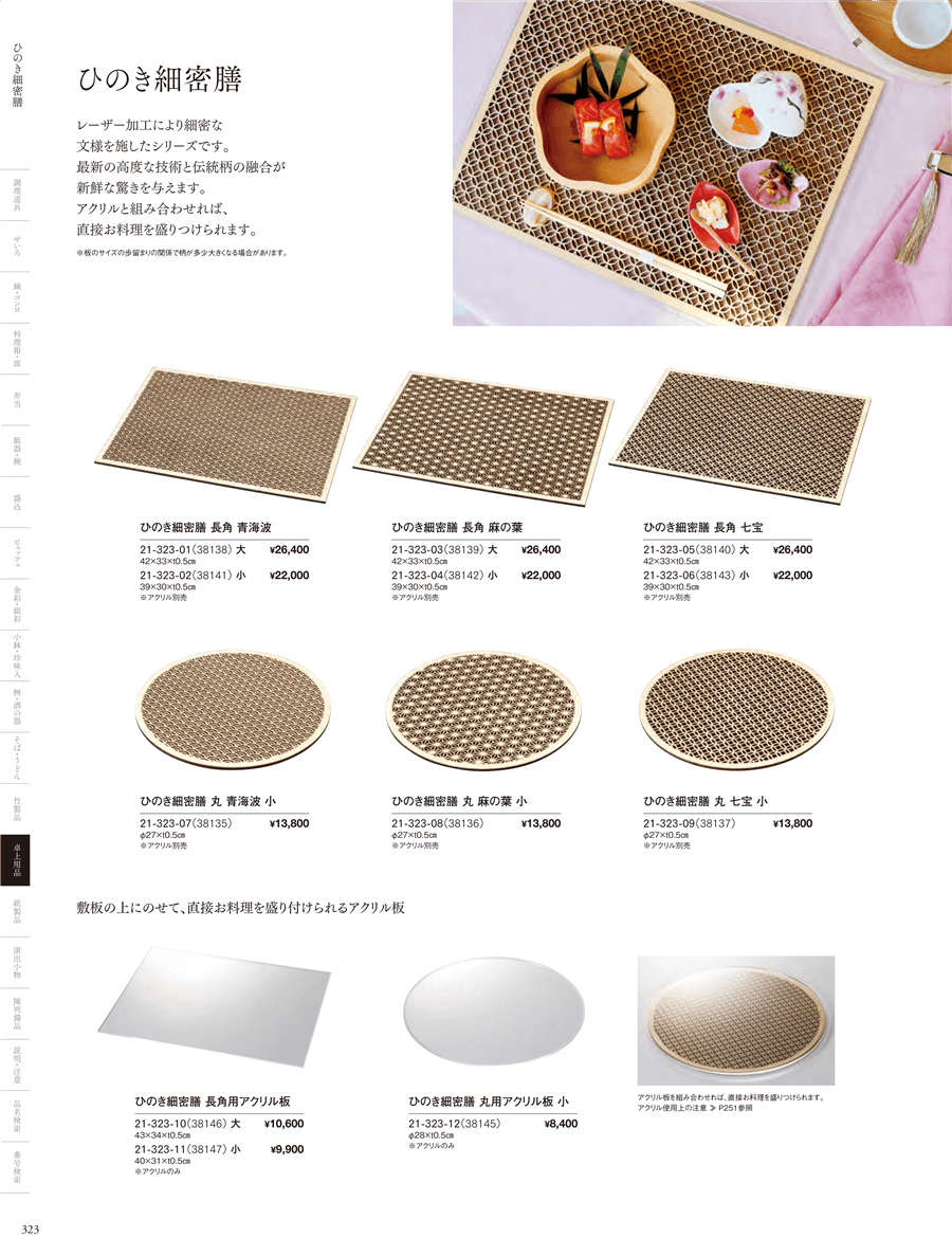 | 21-323-11 | ひのき細密膳 長角用アクリル板(小) | 上代 9,900円(税抜) 卸値 6,534円(税抜) (34%OFF) | ||