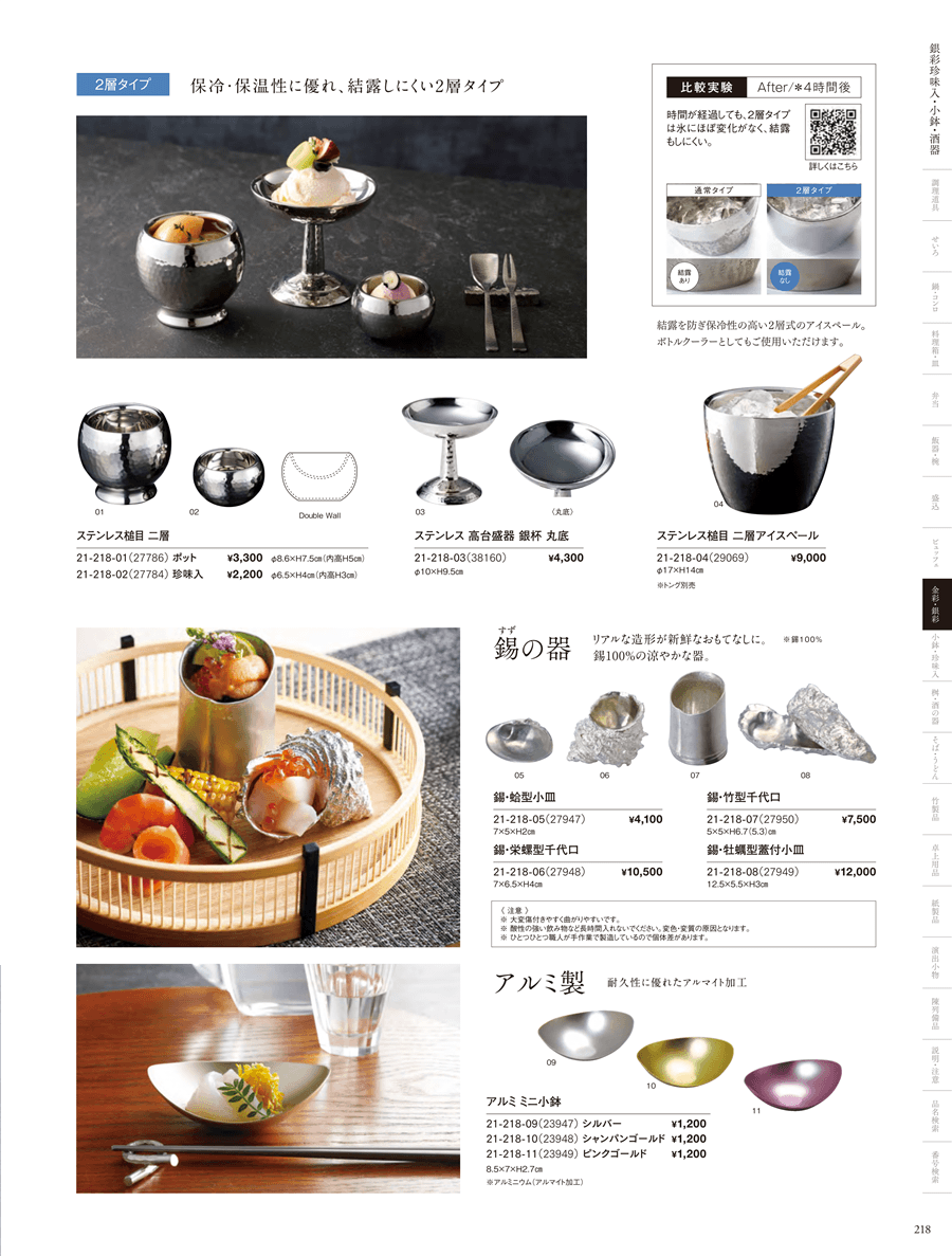 | 21-218-02 | ステンレス槌目 二層 珍味入 | 上代 2,200円(税抜) 卸値 1,452円(税抜) (34%OFF) | ||