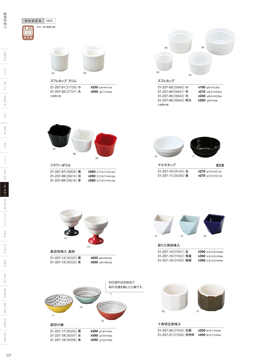 | 21-237-03 | スフレカップ(小) | 上代 190円(税抜) 卸値 126円(税抜) (34%OFF) | ||