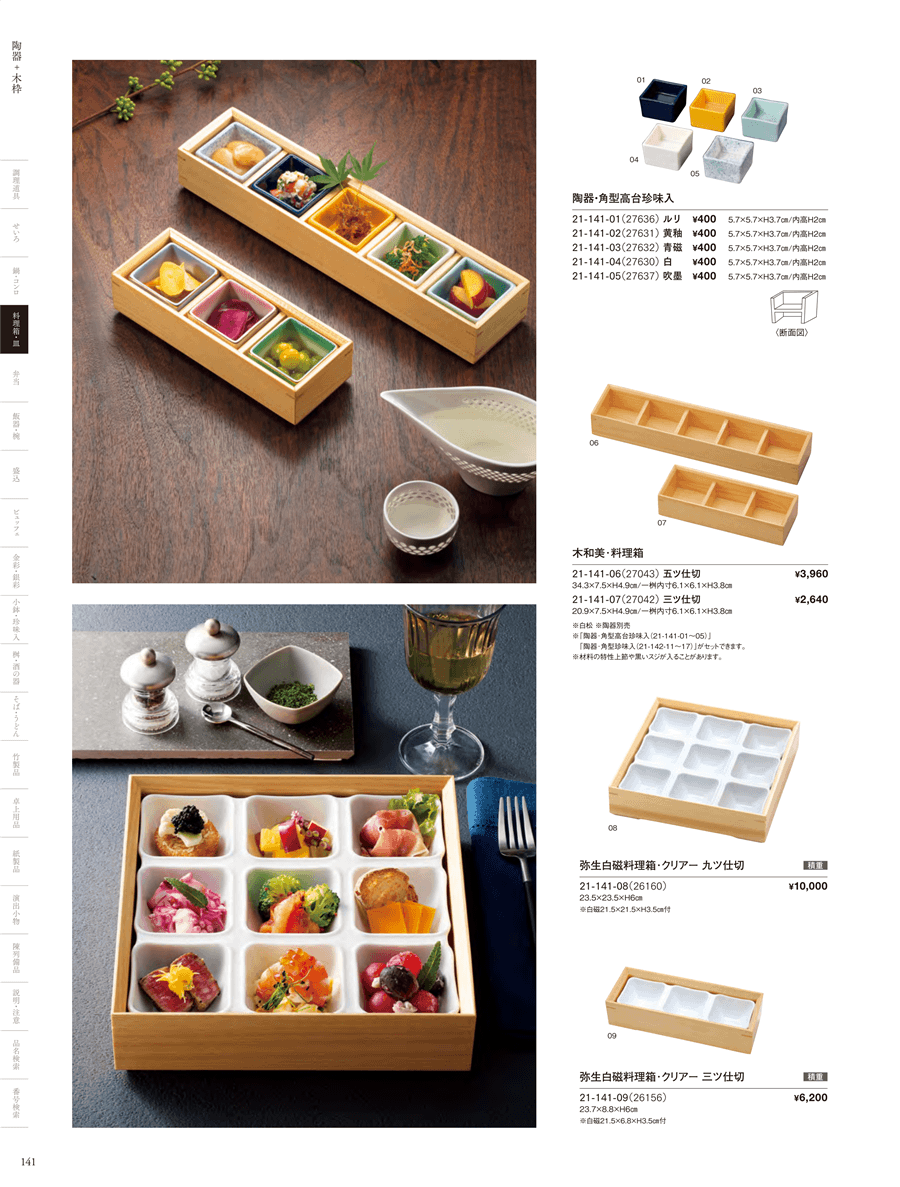 | 21-141-06 | 木和美・料理箱(五ツ仕切) | 上代 3,960円(税抜) 卸値 2,614円(税抜) (34%OFF) | ||
