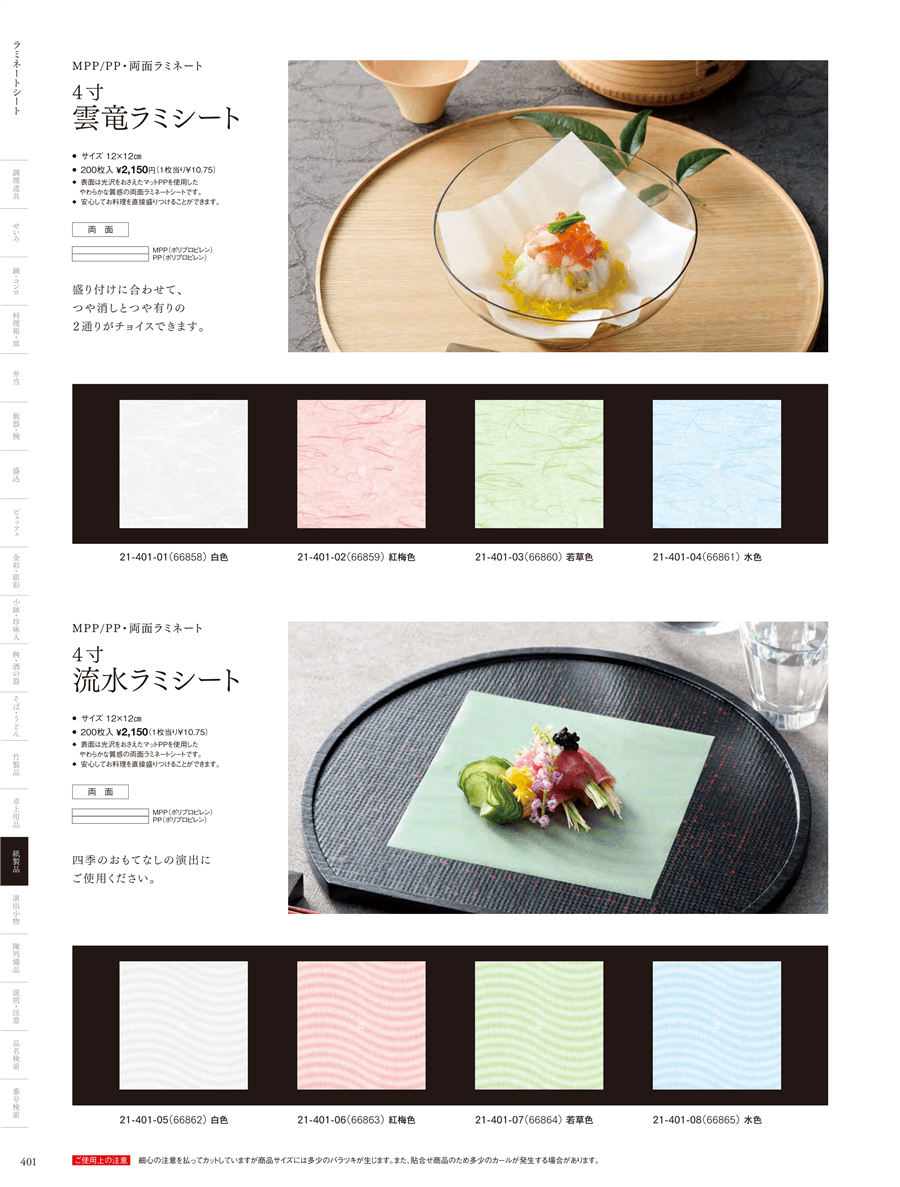 | 21-401-07 | 4寸流水ラミシート 若草色 (200枚入) | 上代 2,150円(税抜) 卸値 1,419円(税抜) (34%OFF) | ||