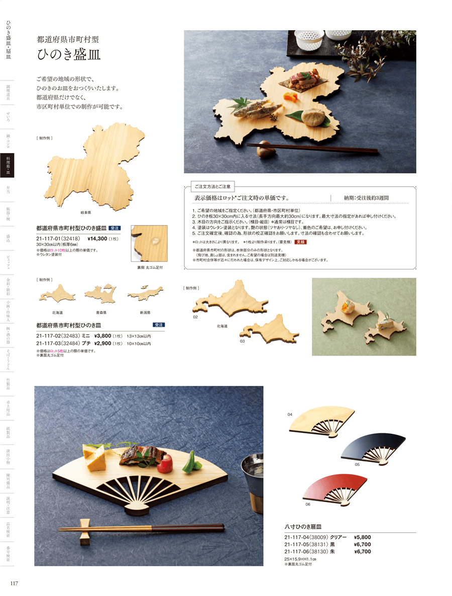 | 21-117-01 | 都道府県市町村型ひのき盛皿(形指定) | 上代 14,300円(税抜) 卸値 9,438円(税抜) (34%OFF) | ||