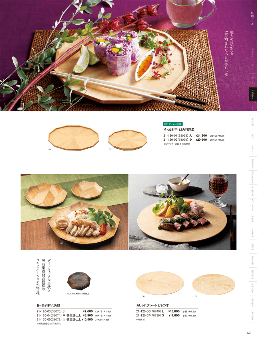 | 21-120-05 | 杉・矢羽材八角皿(大・裏面焼仕上) | 上代 10,500円(税抜) 卸値 6,930円(税抜) (34%OFF) | ||