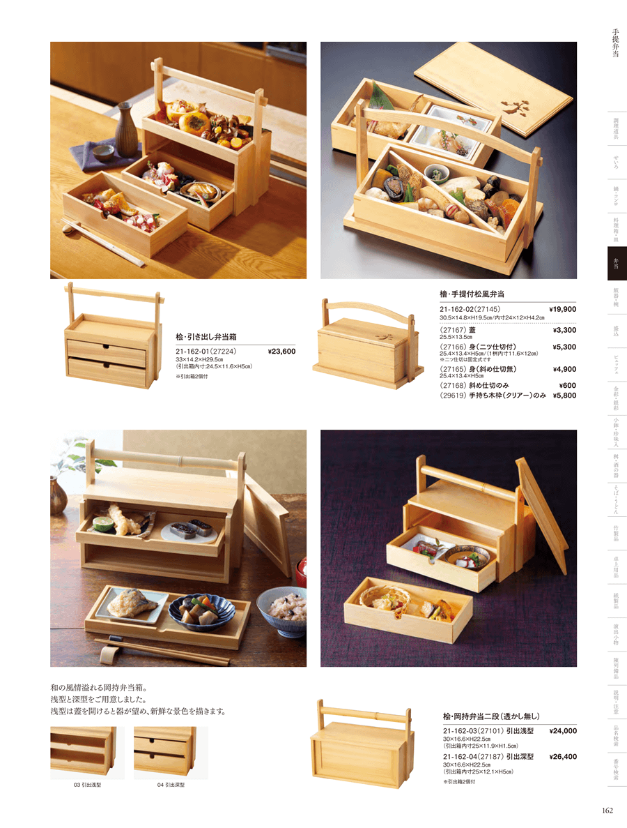 | 21-162-01 | 桧・引き出し弁当箱 | 上代 23,600円(税抜) 卸値 15,576円(税抜) (34%OFF) | ||