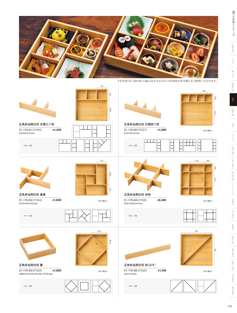 | 21-170-02 | 正角弁当用仕切 片側四ツ切 | 上代 1,500円(税抜) 卸値 990円(税抜) (34%OFF) | ||