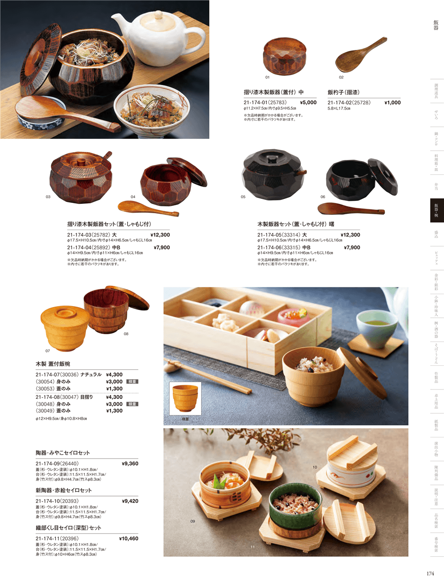 | 21-174-05 | 木製飯器セット(蓋・しゃもじ付) 曙 大 | 上代 12,300円(税抜) 卸値 8,118円(税抜) (34%OFF) | ||