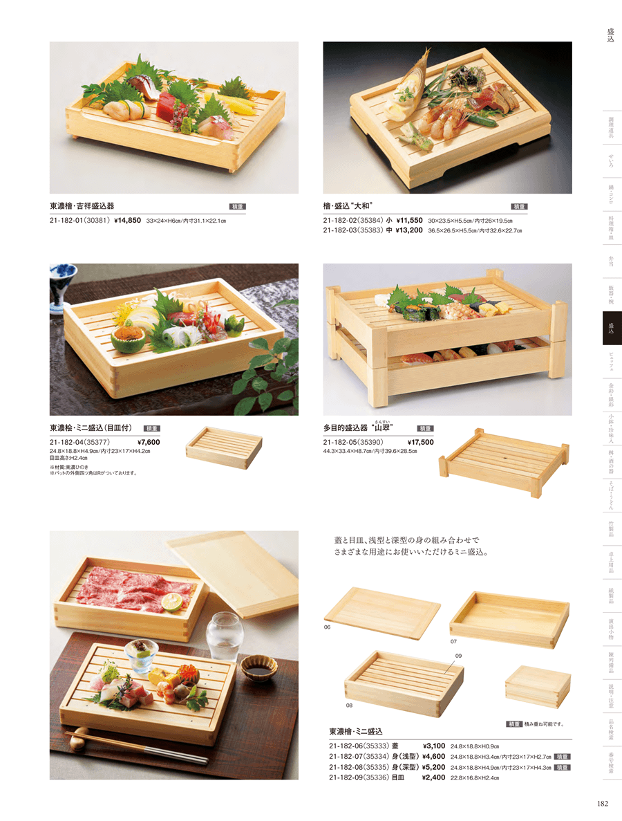 | 21-182-08 | 東濃桧・ミニ盛込 身(深型) | 上代 5,200円(税抜) 卸値 3,432円(税抜) (34%OFF) | ||
