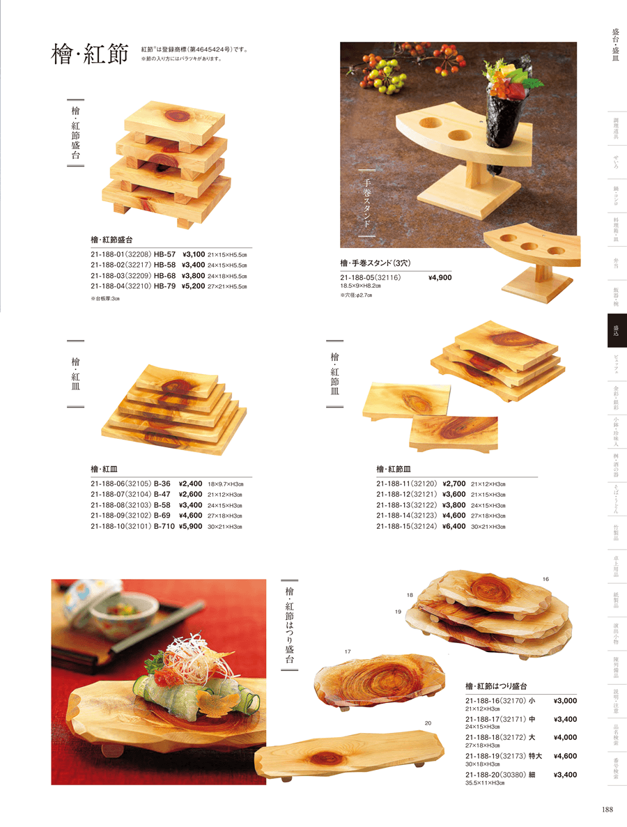 | 21-188-01 | 檜・紅節盛台<HB-57> | 上代 3,100円(税抜) 卸値 2,046円(税抜) (34%OFF) | ||