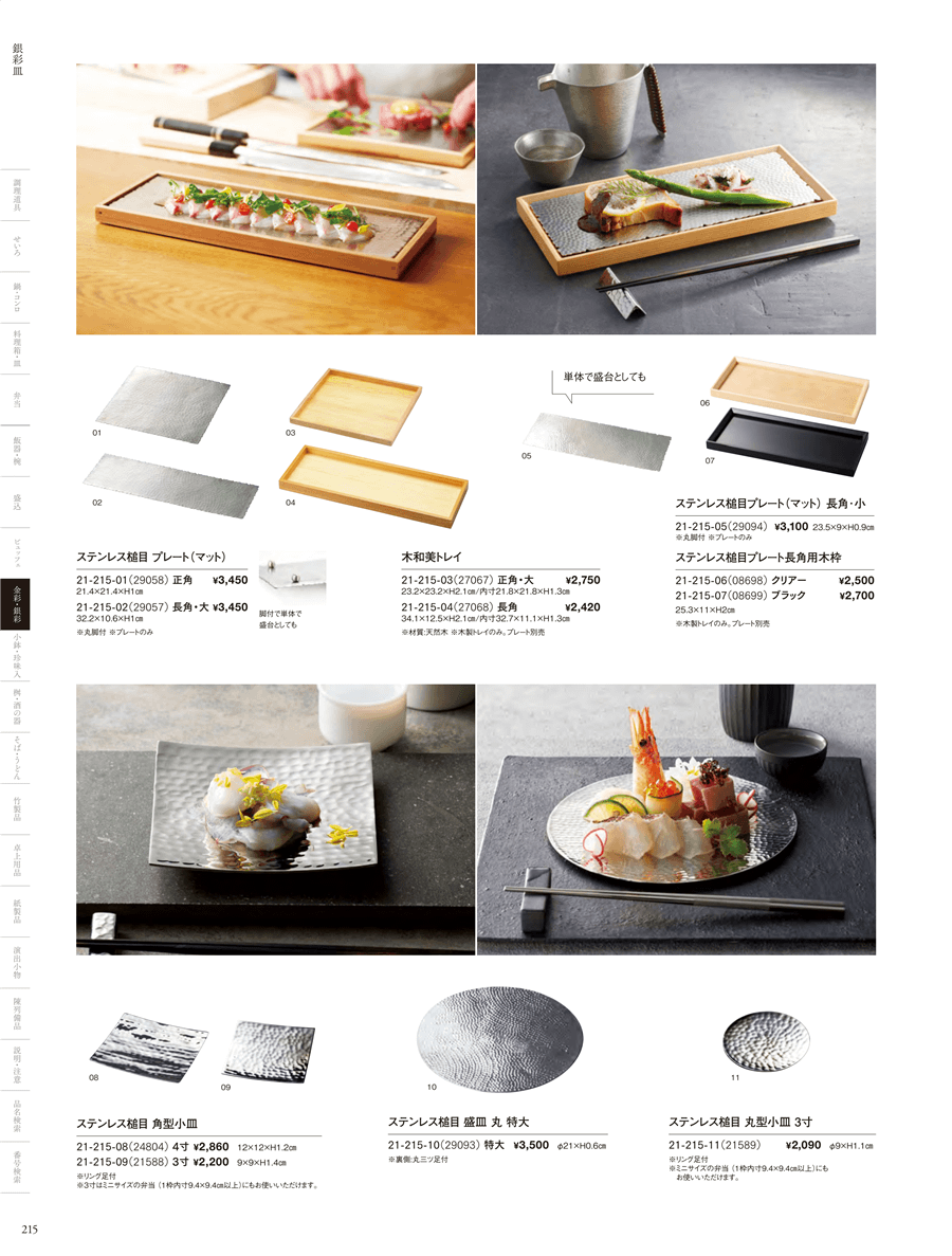 | 21-215-08 | 新・ステンレス槌目四方皿 4寸 | 上代 2,860円(税抜) 卸値 1,888円(税抜) (34%OFF) | ||