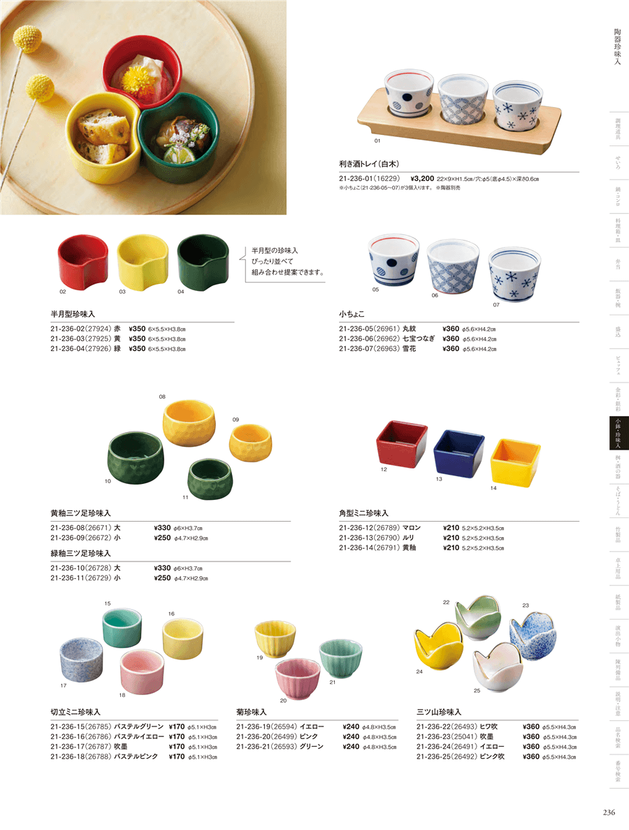 | 21-236-16 | 切立ミニ珍味入 パステルイエロー | 上代 170円(税抜) 卸値 113円(税抜) (34%OFF) | ||