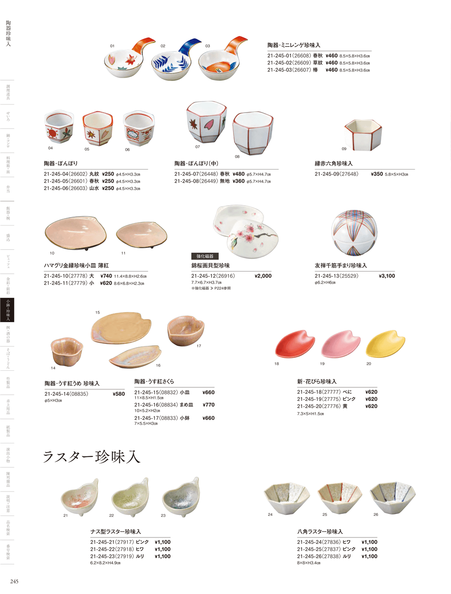 | 21-245-01 | 陶器・ミニレンゲ珍味入 春秋 | 上代 460円(税抜) 卸値 304円(税抜) (34%OFF) | ||